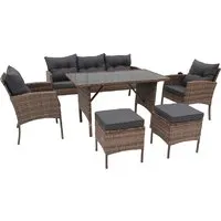 диван (1 шт.), кресло (2 шт.), стол (1 шт.), табурет (2 шт.), для 7 чел, столешница закаленное стекло, каркас искусственный ротанг, сталь. Страна производства: Китай. Также доступны оригинальные подушки различных цветов .